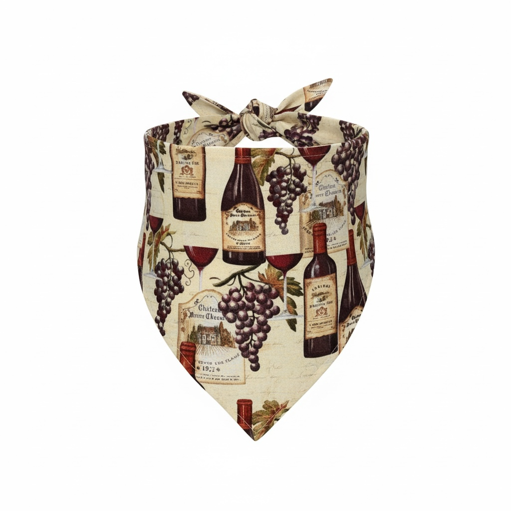-Bandana Print: Creme color with wine bottles, wine glasses, grapes - Cotton fabric.