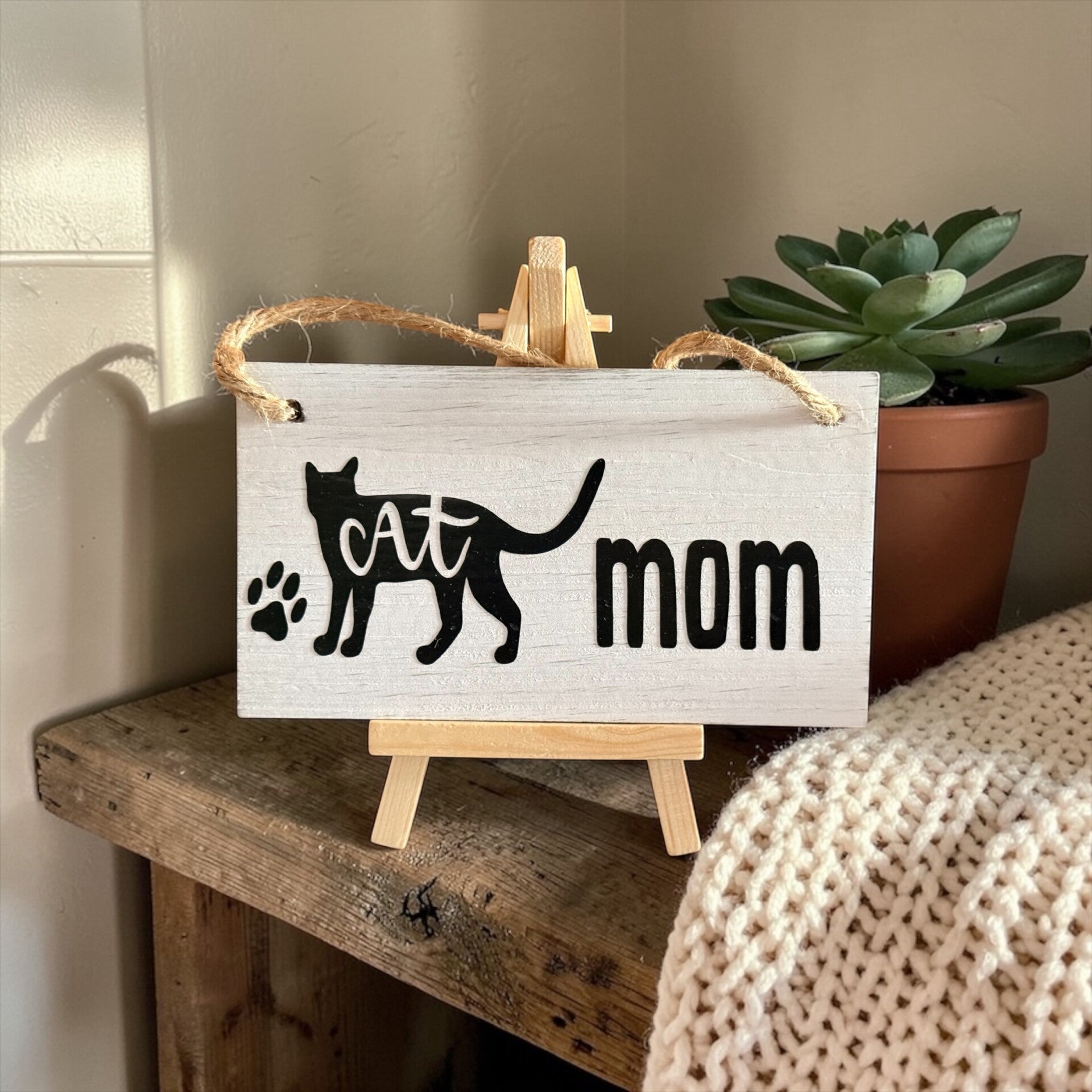 Cat signs. This is great to sit on a desk in an office, on a table, on a shelf or to hang up on the wall. Small easel is included.